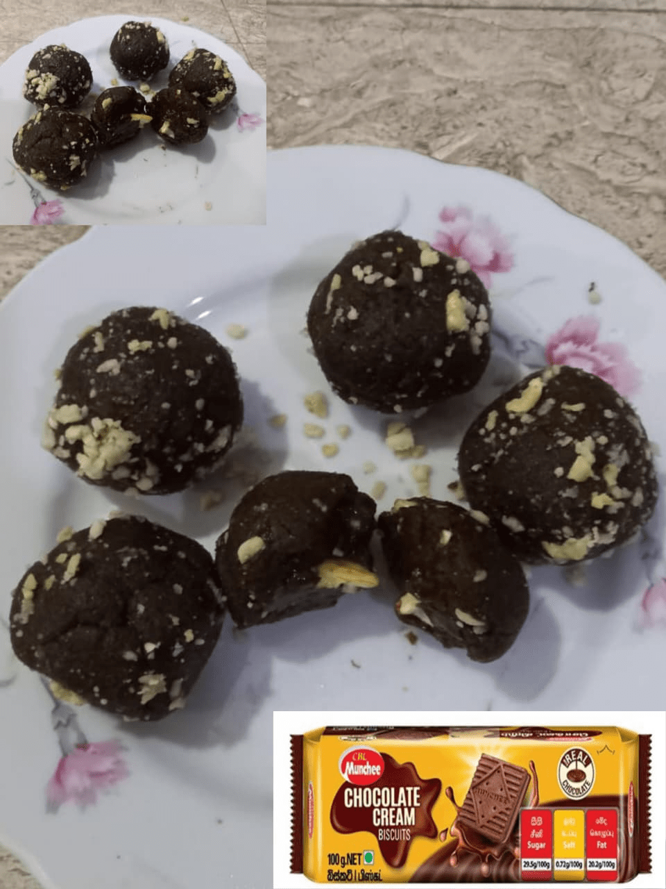 1] මන්චී චොකලට් ක්රීම් බිස්කට් වල ක්රීම් ඉවත් කර grind කර ගන්න 2] සීනි දිය කර ගත් කිරි සමග Grind කර ගත් මන්චී චොකලට් ක්රීම් බිස්කට් මිශ්ර කර ඝන තලපයක් සාදා ගන්න 3] එයට පෙර ඉවත් කර ගත් චොකොලට් ක්රීම් ද එක් කරන්න 4] කැබලි කර ගත් කජු ද එම මිශ්රණයට එක් කරන්න 5] සියල්ල හොඳින් මිශ්ර වූ පසු කුඩා කොටස් බෝල සාදා ගන්න 6] දැන් මන්චී චොකලට් ක්රීම් අග්ගලා රස බලන්න.